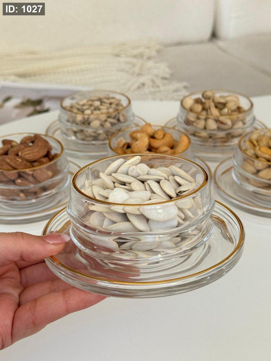 طقم صحون مكسرات + صحون سفح 6+6 شفاف حز ذهبي