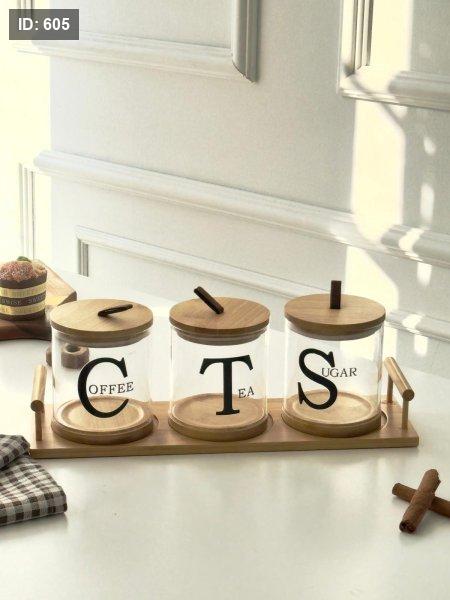 طقم سكريات شفاف 3 قطع + ستاند بامبو