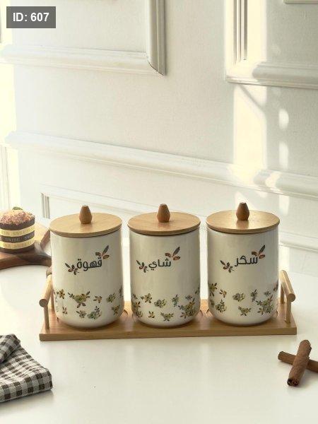 طقم سكريات بورسلان 3 قطع + قاعده بامبو