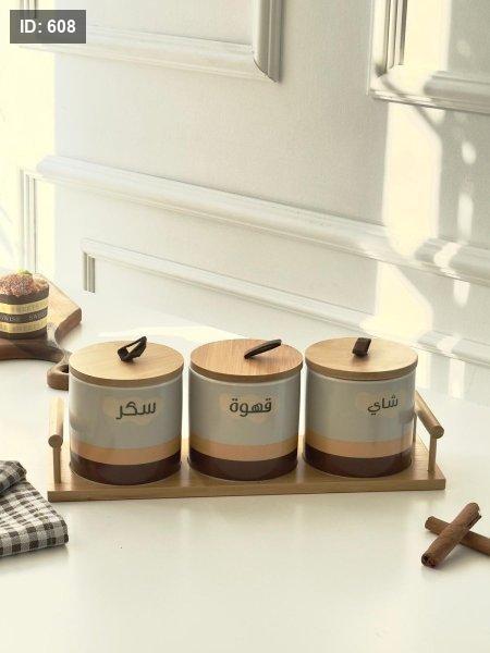 طقم سكريات بورسلان 3 قطع + قاعده بامبو